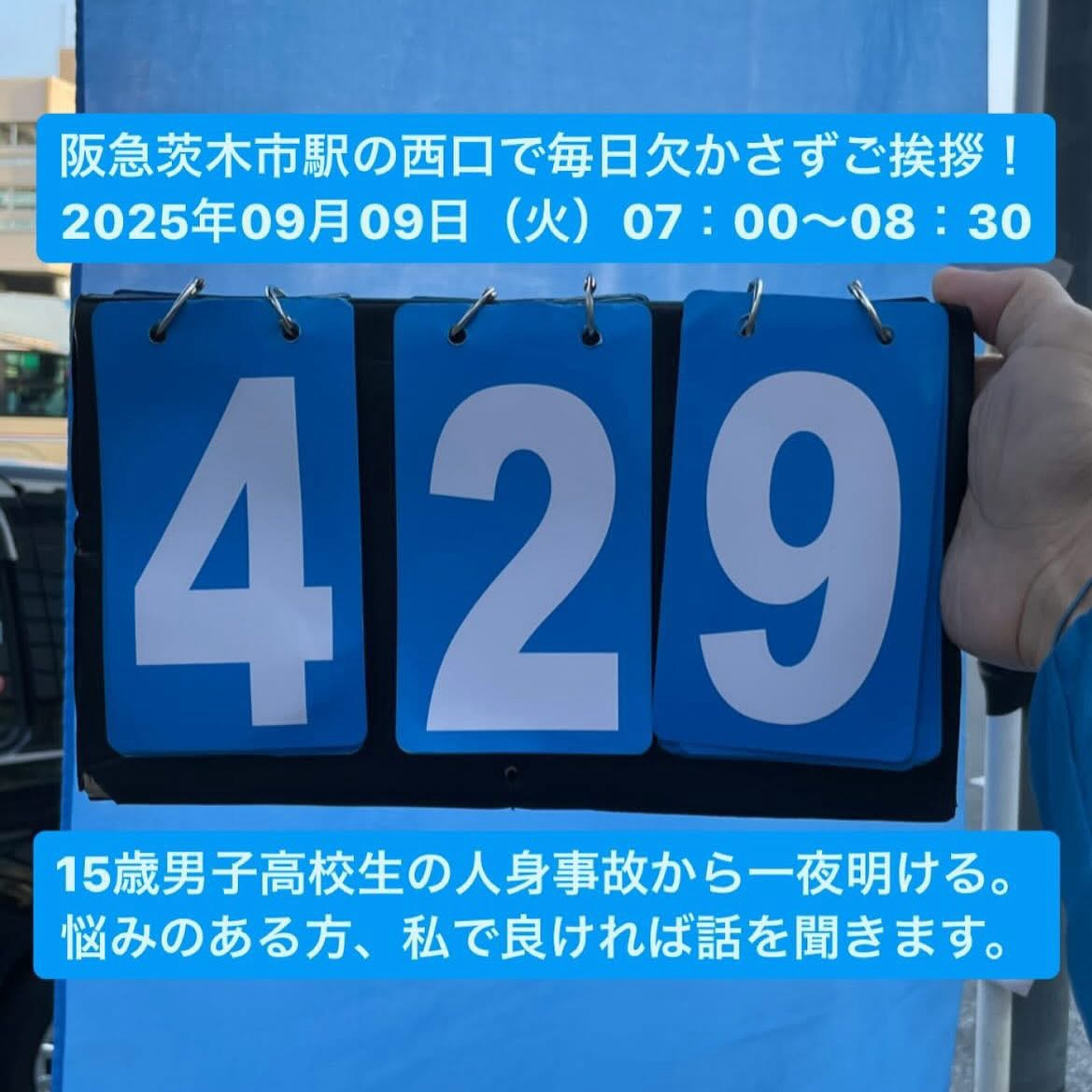 阪急茨木市駅にて429日連続のご挨拶